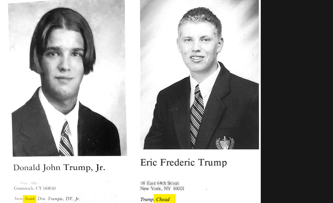 As noted by Tom McKay, the sons of outgoing president Trump enjoyed the nicknames "stank" and "choad" as high-schoolers. Don Jr is Stank, Eric is Choad. These revelations come courtesy of their yearbooks.